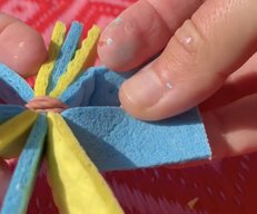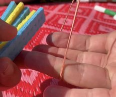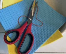 - Nun die beiden Wettex-Streifen in der Mitte rund und kurz schneiden, um danach mit einem Buntstift die Monsteraugen drauf zu malen.