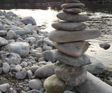 Beim Weiterspazieren stieß ich allerdings auch auf nette Überraschungen. Jemand hatte aus Flussteinen einen kleinen Turm gebaut. Sehr hübsch anzusehen im Sonnenuntergang. Solche kleinen Skulpturen finde ich schön. Oder auch Schriftzüge aus Steinen im Sand. Das sind Spuren von Mitmenschen, über die ich mich freue. Jemand war hier und hat in Achtsamkeit etwas Nettes hinterlassen. Ein andermal fand ich ein Kränzchen aus Weidenzweigen und Blumen, auf einen Ast gehängt. Auch sehr hübsch und kreativ! Und viel schöner als Plastikflaschen!!!